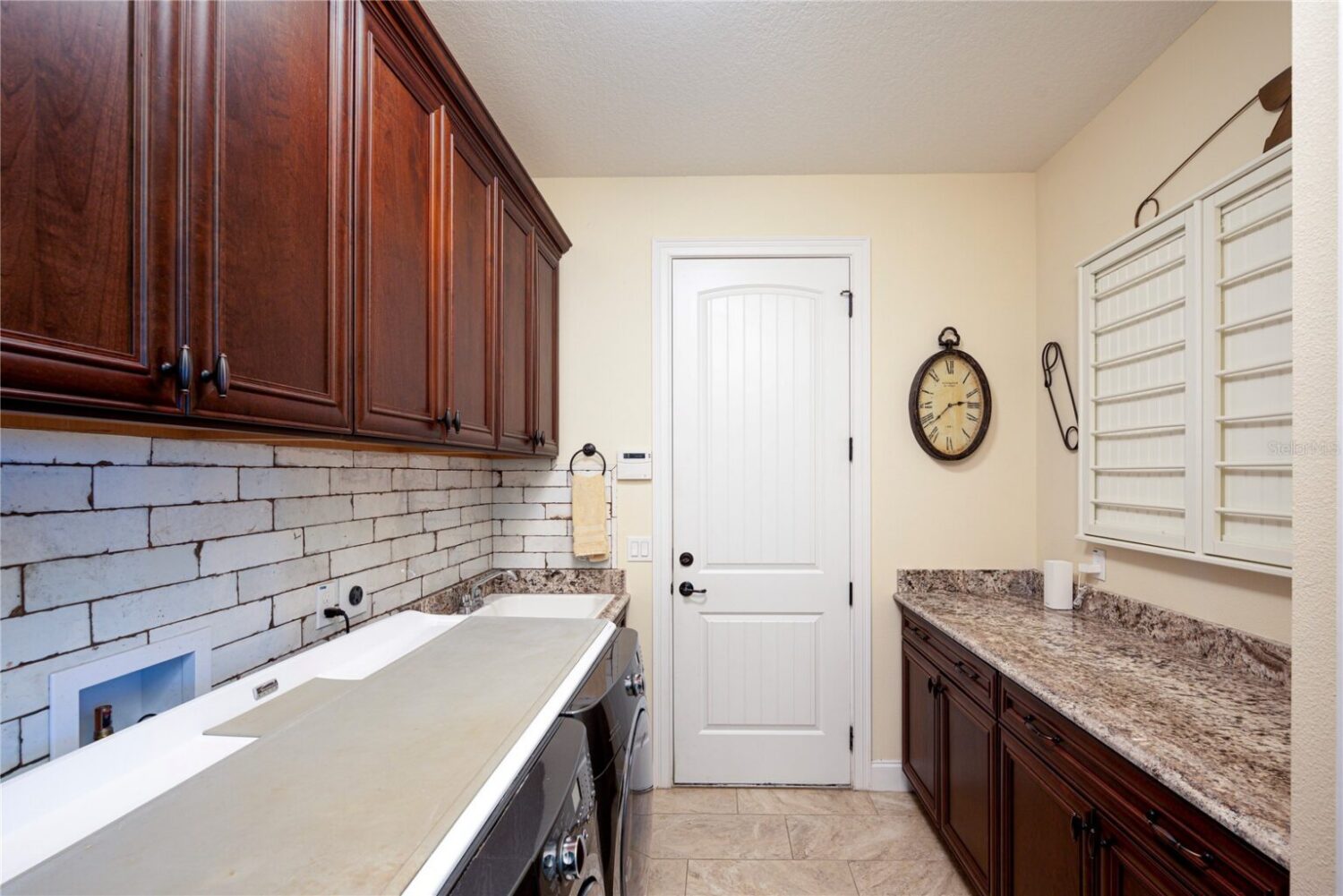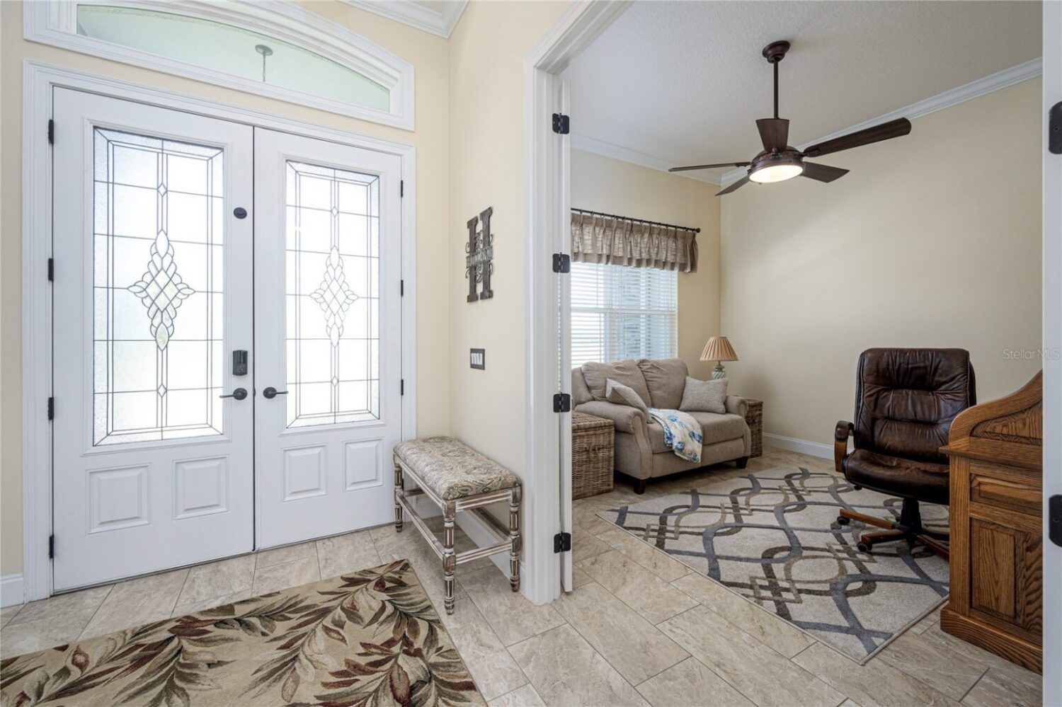 This luxurious 4-bedroom, 3-bathroom home offers an open floor plan with stunning views of the screened-in outdoor pool and Central Florida countryside. The residence is bright and inviting, with an office and triple split-bedroom layout, cathedral ceilings, and a cozy fireplace. For culinary enthusiasts, the eat-in kitchen is a dream come true, featuring a large eat-in kitchen with Cherry cabinets, granite countertops, a large island with seating, Bosch 800 Series appliances, a 5-Burner gas cooktop, a built-in wine rack, accent lighting, and a walk-in pantry. The great room has an 11’ pop ceiling, built-in features, a gas fireplace, built-ins, plus French doors leading to the lanai and pool area. The primary suite boasts two walk-in closets and a luxurious en-suite bathroom with dual vanities, a walk-in shower, and a soaking tub. Spacious laundry room with a laundry sink, granite countertops, and built-in cabinets.